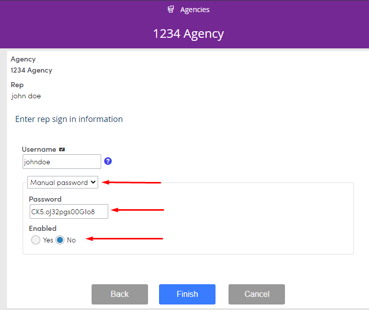 If you do not want your agent to log on, or you would like to create a custom username and password, choose Manual password from the dropdown. You can also choose to Enable the user later on.
