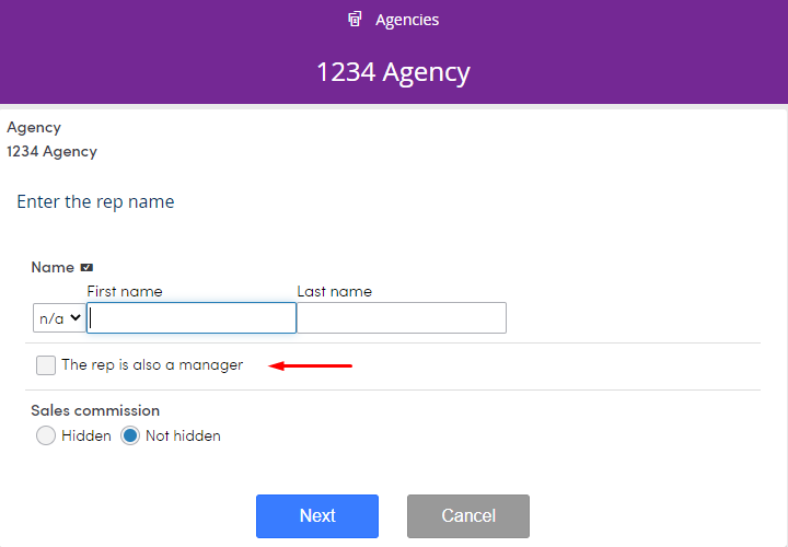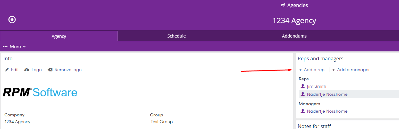 Top menu >> Agencies >> View an agency>> +Add a rep the Reps and managers web box.