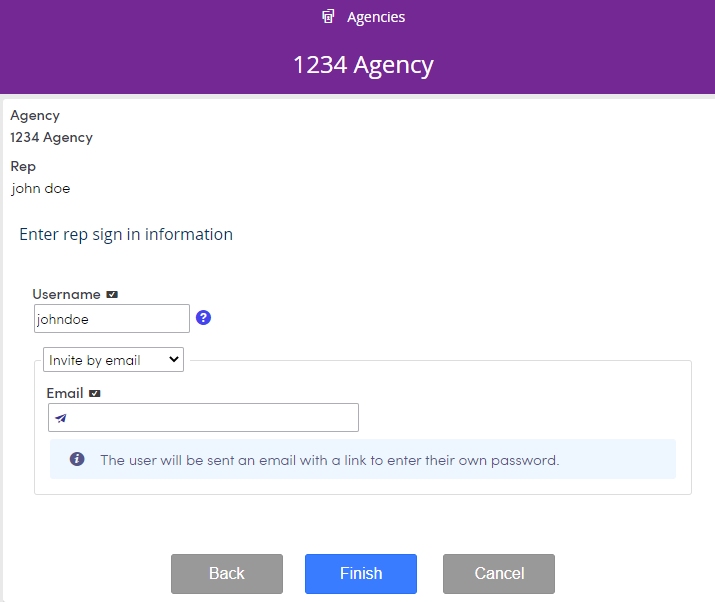 If you want the agent to log on you can choose to Invite by email (default), enter the email address. Finish. This will send an email to the agent with a link that will allow them to create their own password and log on to your RPM. This will automatically enable the user when the rep creates a password.
